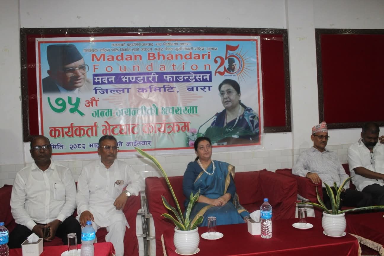कलैया बारा: मदन भण्डारी फाउन्डेशन मधेश प्रदेश कमिटीले आयोजना गरेको ७५ औं जन्मजयन्ती समारोह अन्तर्गतको कार्यकर्ता भेटघाट कार्यक्रममा पूर्व राष्ट्रपति विद्या देवी भण्डारी सहभागी भएकी छन्।